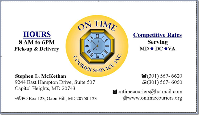 On Time Courier Service, Inc. is a full service courier company dedicated to providing prompt, courteous and reliable service. We serve a wide variety of businesses throughout the Washington Metropolitan Area and beyond.